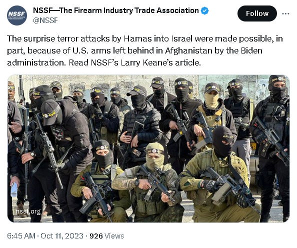 The positive identification corroborated earlier reports by the IDF that Hamas had obtained US small arms left behind by the US in Afghanistan.