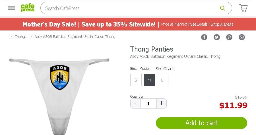While all this is going on in Ukraine, decadent Westerners are busy shopping for an Azov thong for nana for Mother’s Day.