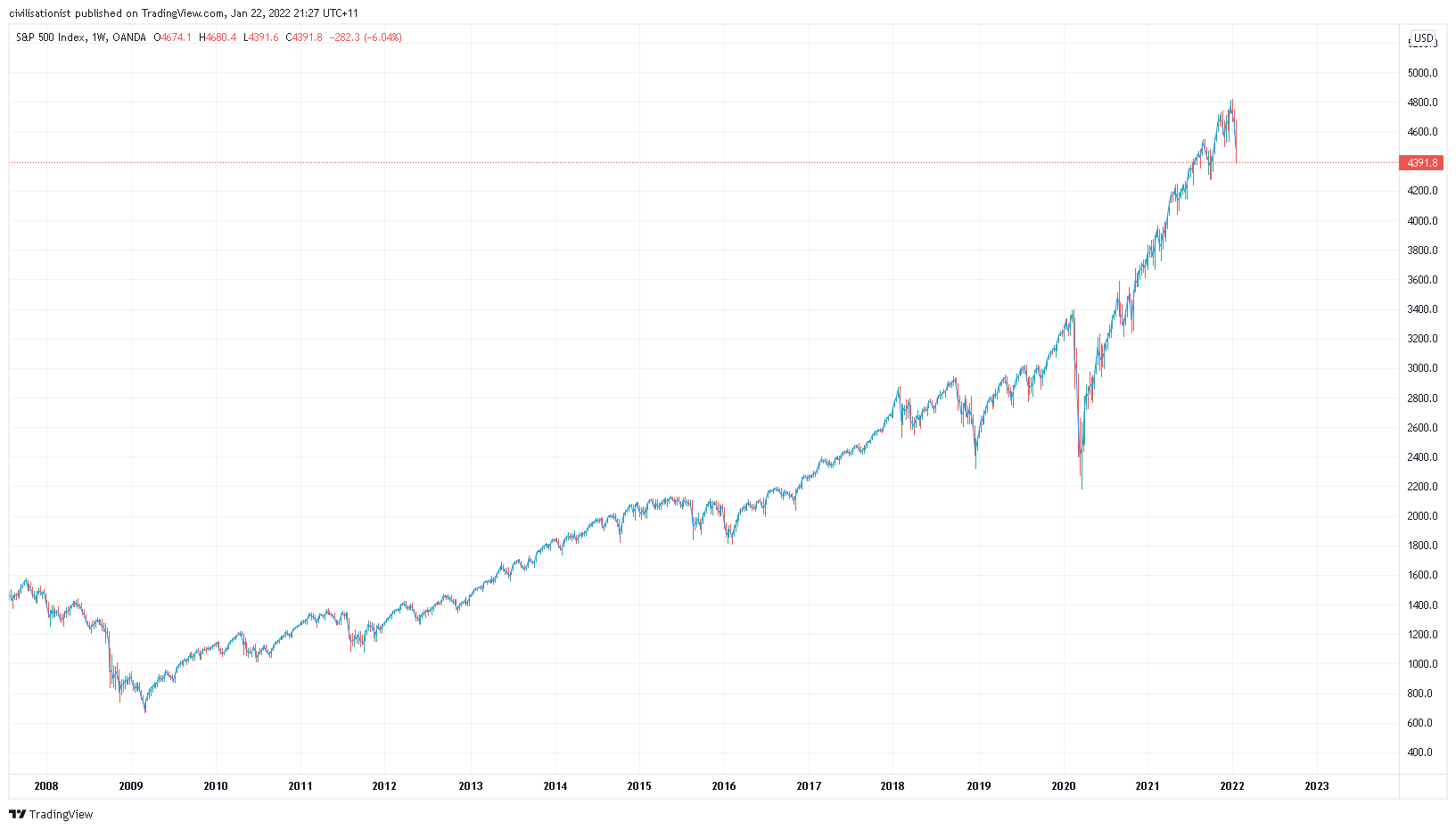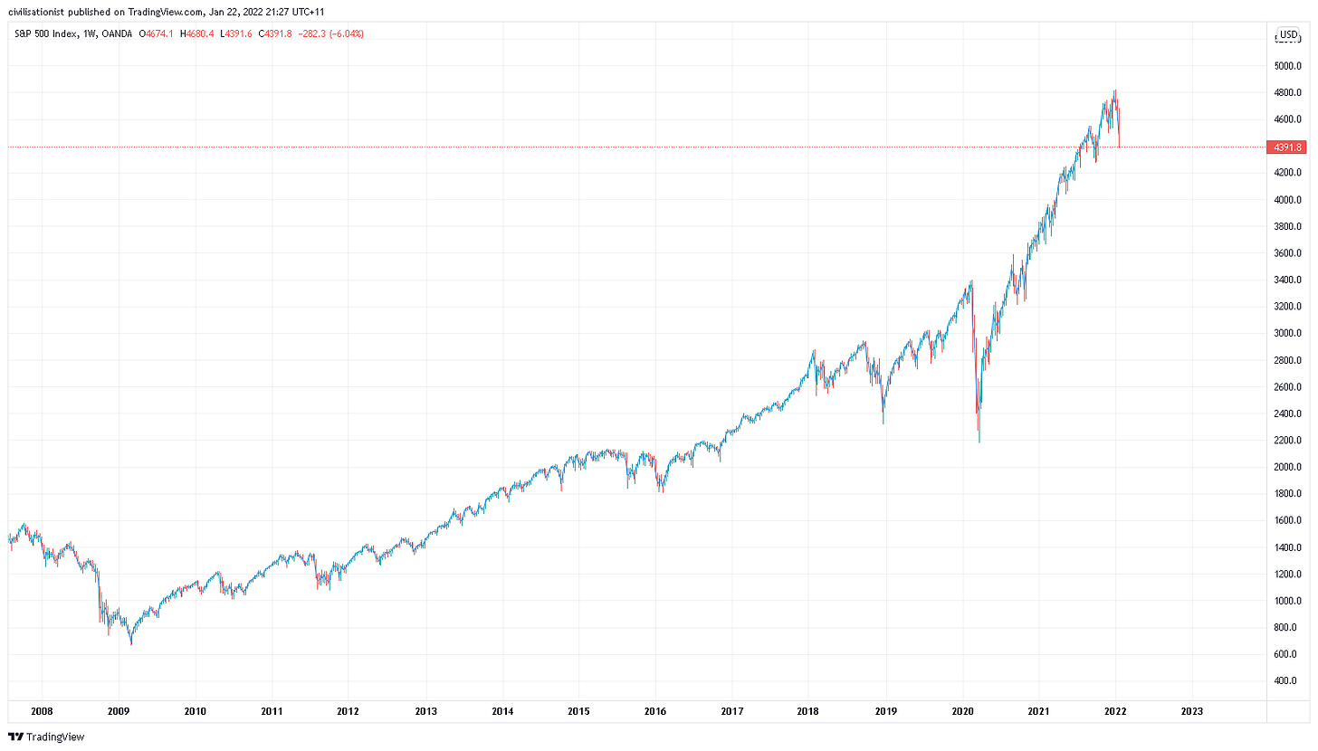 That there is a weekly chart for the S&P500 (a big US stock index) going back to 2008, the time of the aforementioned Global Financial Crisis. If, like me, maths wasn’t your strong suit at school, let me help you interpret it.