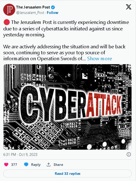 Throughout the weekend, many Israeli government and news outlet sites including the Jerusalem Post were taken offline, some for days.