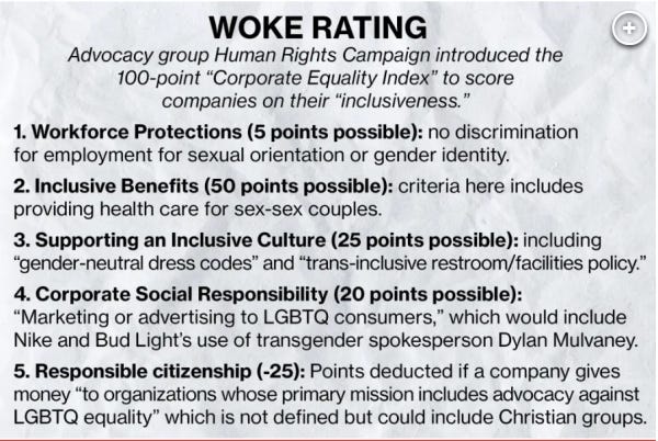 The way this is achieved is via the Corporate Equality Index (CEI). It’s a woke scoring system published by the HRC which promotes and penalises corporations for how much gayness they push onto society. They use a 100-point scoring system to do so.