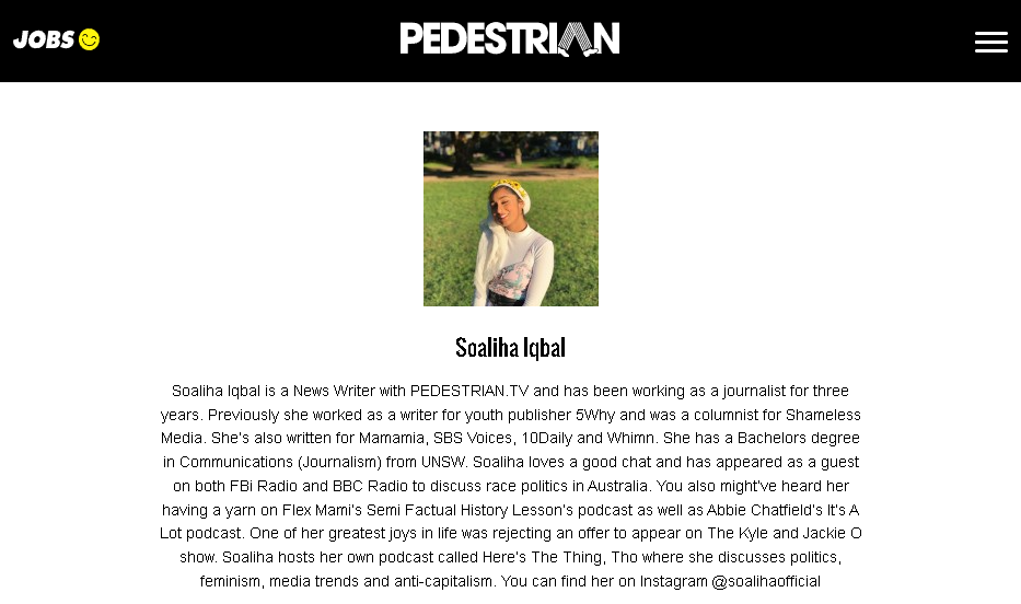 She writes for Pedestrian, which until recently was under the editorial control of Senator Mehreen Faruqi’s son Osman.